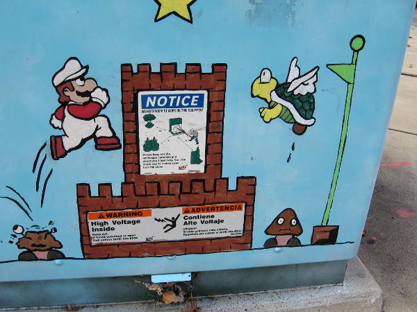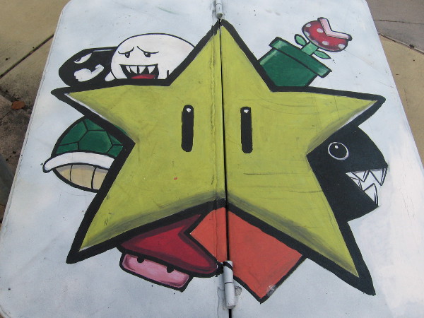 Painted utility and transformer boxes near the corner of National CIty Boulevard and East 8th Street feature a variety of colorful Japanese video game characters.Sonic the Hedgehog of Sega Games has been painted on a utility box in National City.Bub and Bob originally from the 1980s Taito video game Bubble Bobble.Street art depicts Link of The Legend of Zelda video game series.A cute street art rendition of Princess Peach from the Mario video games.Pikachu sits atop a Pokémon Poké Ball. Fun street art in National City.The character beneath the Poké Ball looks somehow familiar, but I can’t figure this one out… Okay, a coworker identified him! It’s Finn the Human from the animated television show Adventure Time. Not of Japanese origin, apparently, but he has appeared in video games!Chocobo from the Final Fantasy video games. Happy street art painted on a utility box.Luna from the popular Japanese manga series Sailor Moon. I’m not sure if Luna appeared in any video games.Nintendo’s pop culture icon Mario fights Gooper Blooper in this fun, nostalgic street art.A green Super Mario Koopa Paratroopa flies over a castle while our leaping hero steps on a Goomba!A villainous Rocky Wrench pops out of a hole to attack Mario in this video game street art!I believe these are various images of enemies from the Mario video game franchise on top of the transformer.Super Mario Galaxy has our hero capturing Power Stars in Outer Space! More street art in National City!