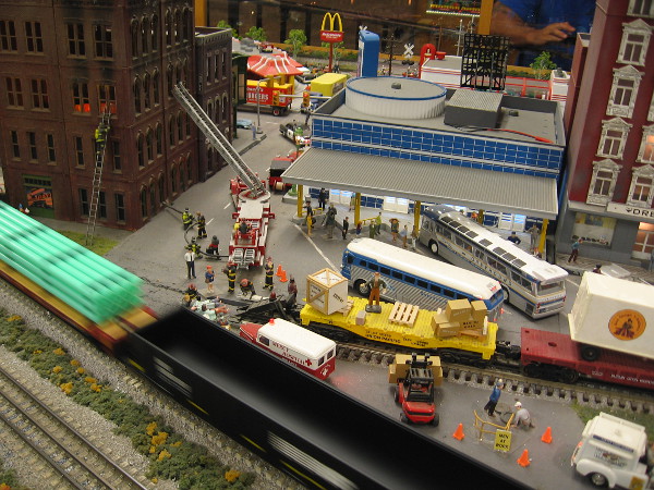 The colorful layout features O-Scale Lionel-type trains running through a world full of sound and movement. Signs and billboards light up. Cars pull in and out of driveways. People move back and forth. Ghostbusters contend with a rampaging Stay Puft Marshmallow Man.