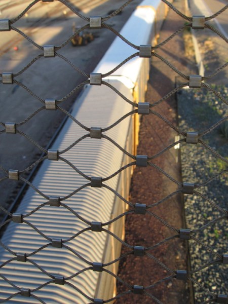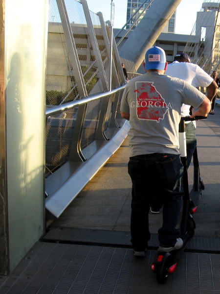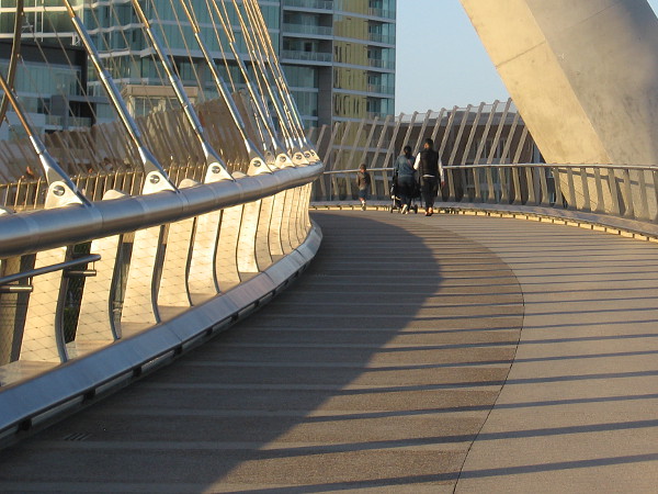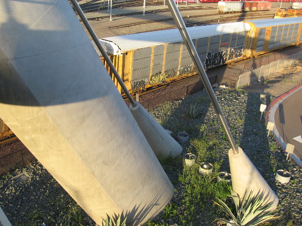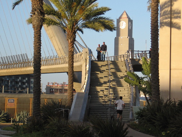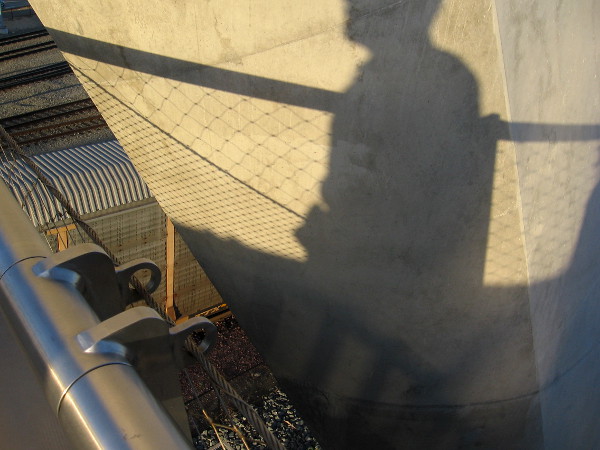 As I came to the pedestrian bridge over Harbor Drive, the late sunlight produced magic. The space through which I walked and the train tracks below appeared dreamlike.