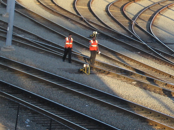 This morning and afternoon I walked along C Street to and from the City College trolley station. I simply had to pause to watch as workers tore up a section of old asphalt and rails running down the center of the street, then later as the workers carefully dumped and leveled new track ballast. I asked one friendly guy who seemed to be supervising if the rails were old and he replied that was the case!