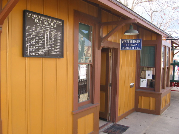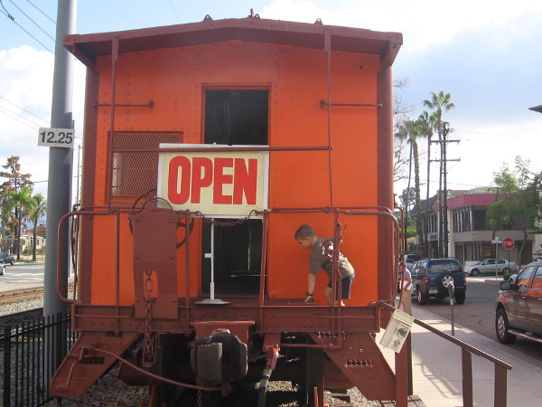 Locomotive was donated after 43 years of service to the Pacific Southwest Railway Museum Association.Looking up into door of steam locomotive Mojave Northern Railroad #3.Old No. 3 originally hauled lime from a quarry near Victorville, California.Part of the complex machinery and controls in the steam locomotive’s cab.Pacific Fruit Express reefer car on display at old train depot in La Mesa, California.Southern Pacific Railroad caboose can be boarded free by visitors on Saturdays, 1-4 pm.I saw a bunch of people during my short visit. There were many excited kids!Entering the caboose, to check out what life was like working on the railroad.The conductor had high windows to see around the train during operation.A freight train’s conductor or crew could sit up here to see in every direction.That’s quite a climb, even for a tall guy like me!The small La Mesa depot sits near tracks now used by the San Diego Trolley Orange Line.The depot opened in 1894, and this 44-star flag would’ve flown above it.Information sign outlines the early history of La Mesa’s train depot.Historical photograph of a train stopping at La Mesa.In the early 20th century the depot was sold and moved on various occasions.McKeen Car at the La Mesa Depot.This very small building contains lots of cool stuff!City of La Mesa Historic Landmark No. 6 on side of 1894 train depot.Ticket office in depot contains various old telephones and a telegraph.The telegraph key still works!Telegraphic messages were received here!Looking out through ticket window at the tiny train depot waiting room.In one corner of the office is an old-fashioned manual typewriter.This old wood stove still works and provides a lot of heat!Signs bring to life the old train time table and Western Union office.An old railway hand cart for hauling freight or luggage.Sign tells complex story of the San Diego, Cuyamaca and Eastern Railroad.Here comes the San Diego Trolley, approaching the nearby La Mesa Boulevard station.The La Mesa Depot Museum is a fun place to visit on a Saturday afternoon!
