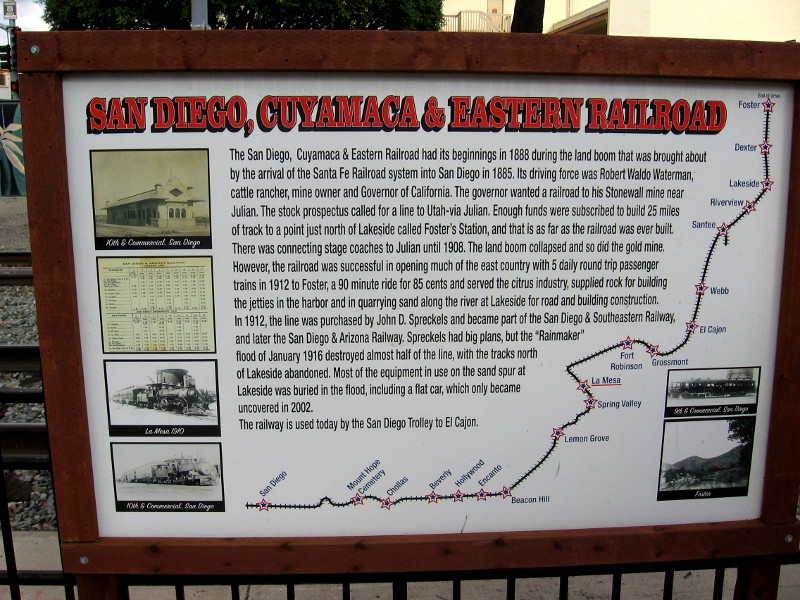 Outdoor passage between the Santa Fe Depot and the Museum of Contemporary Art San Diego’s downtown Jacobs Building, which years ago was the train station’s baggage terminal.John D. Spreckels and the Impossible Railroad is one of the current art exhibitions at MCASD. These interesting promotional graphics also incorporate historical newspaper articles.Old advertisement for the San Diego and Arizona Railway, called the Carriso Gorge Route, which included possible destinations Chicago, New Orleans, Kansas City, El Paso, San Diego.