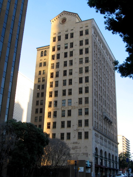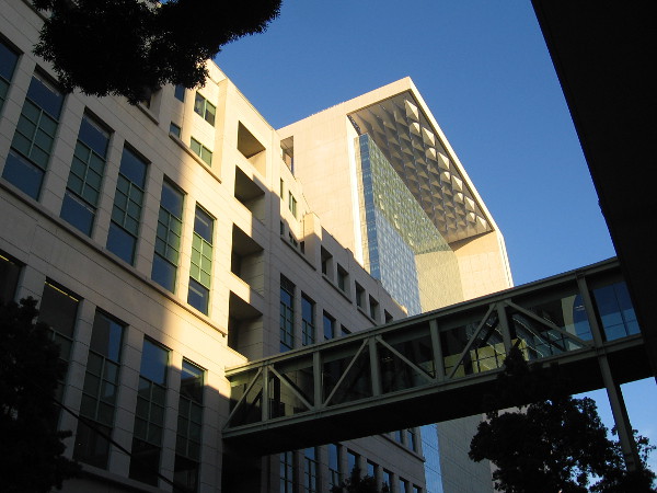 The San Diego Symphony has a brand new banner on the west side of Symphony Towers. Find Your Music.Almost to B Street. Some cool reflections produced by the early sunlight.This reflection of a tree on windows seems dreamlike, unreal.The old Centre City Building might have peeling paint, but it still rises handsomely into the San Diego sky. One edge is touched by the morning sun.The cool old Caliente ad remains on the rear of the abandoned California Theatre building. I don’t know if it will be preserved when the historic building makes way for a new 40-story The Overture high-rise.Shall I catch a trolley at the Civic Center station? Nah. I still have plenty of time.Workers were cleaning awnings over the ground floor windows of the U.S. Grant Hotel.As I walked along Broadway past some construction, it looks like I frightened a couple of people!The brand new San Diego Central Courthouse behind the Hall of Justice provides an interesting photographic opportunity.Almost to Santa Fe Depot. Just missed a Green Line trolley. I’ll wait for the next one.