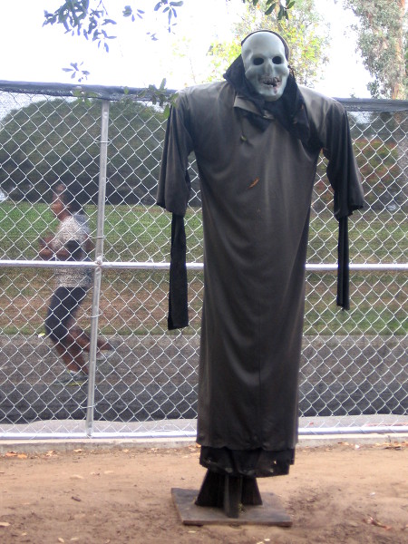 Runner in Balboa Park passes behind a grinning ghoul!