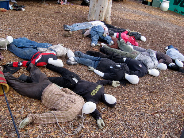 Mangled cloth mannequins lie limp and lifeless on dead leaves.