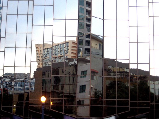I got some unusual photos of the clock tower that stands next to the transit center at the 12th and Imperial trolley station downtown. The clock is one cool San Diego sight that can be seen from many points in the city.