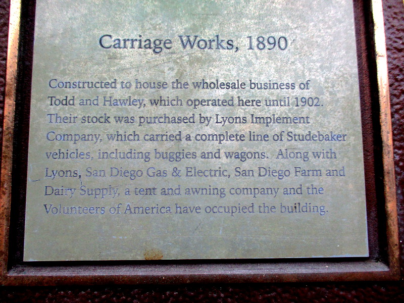 Constructed to house the wholesale business of Todd and Hawley, which operated here until 1902. Their stock was purchased by Lyons Implement Company, which carried a complete line of Studebaker vehicles, including buggies and wagons. Along with Lyon, San Diego Gas & Electric, San Diego Farm and Dairy Supply, a tent and awning company and the Volunteers of America have occupied the building.