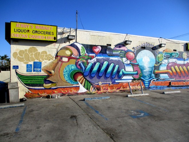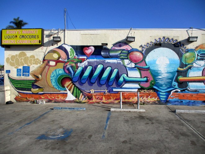 This really great mural can be found on the parking lot wall outside Jerry’s Market, in San Diego’s southeast community of Mountain View, at the corner of Logan Avenue and 45th Street.
