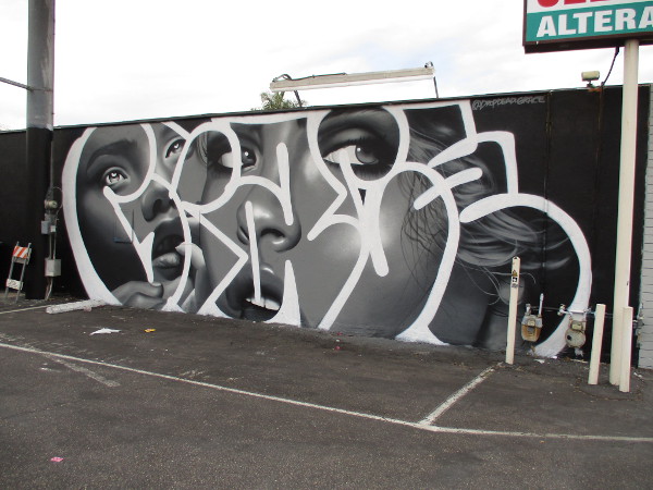 Here come photographs of four cool murals in Pacific Beach! Until a recent random walk through PB, I hadn’t seen any of this artwork.