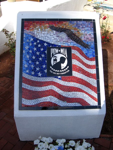 During a moving Memorial Day ceremony, a black cloth concealing the monument was removed, revealing a gorgeous mosaic showing the American flag, a soaring eagle, and at the center the POW/MIA emblem. The artists who created the mosaics at the Vietnam War Memorial in La Mesa were also responsible for this stunning work.