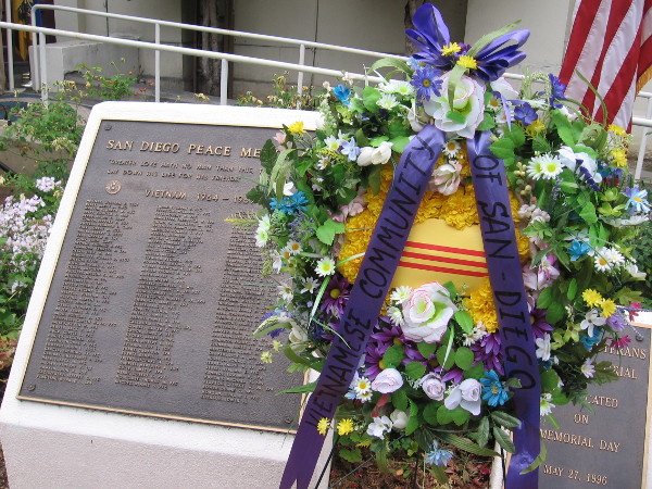 Vietnamese Community of San Diego wreath stands by Peace Memorial.