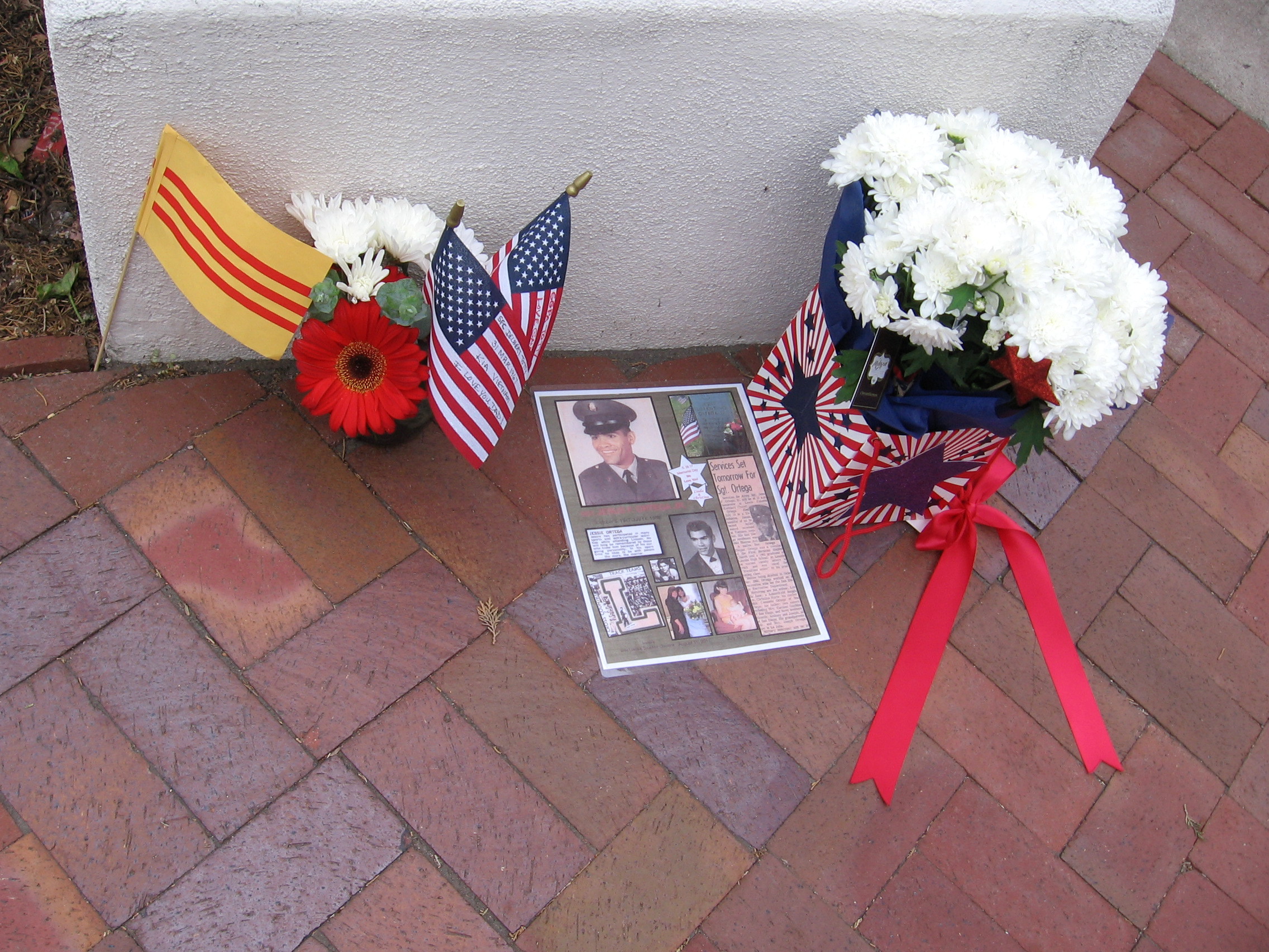 Flags are readied.Salutes.A dignified program commences. The Vietnam War is remembered, and those who fell during the conflict are honored.Speeches recall the harsh realities of war, and the democratic ideals many fought to defend.All quietly listen, some remember.Joyful, triumphant singing. America the Beautiful.Love for country. Young and old salute.A folded flag above the plaque marking the Vietnam Veterans Peace Memorial in Balboa Park.Names of San Diegans who were killed or designated missing in action during the Vietnam War fill half a dozen bronze plaques.Flags, flowers and photos. A loved family member.On March 7, 1971, at the age of 21, David Jesus Naranjo perished in the service of our country in South Vietnam, Quang Nam.