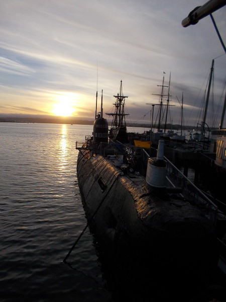 Tourists walk among many historic boats and ships behind the steam ferry Berkeley. The racing sloop Butcher Boy is over a hundred years old. It sailed rapidly out on the bay, always first to provide fresh provisions to visiting ships.School students learn how to handle an oar, before heading out on San Diego Bay in a museum longboat.Sun gently falls behind the picturesque deck and rigging of HMS Surprise.A winter sunset paints the sky behind the B-39 Soviet submarine and the masts of several ships, including Californian, San Salvador and America.HMS Surprise, steam ferry Berkeley, and a beautiful sky.A soft sunset and still water. Nightfall on San Diego Bay.
