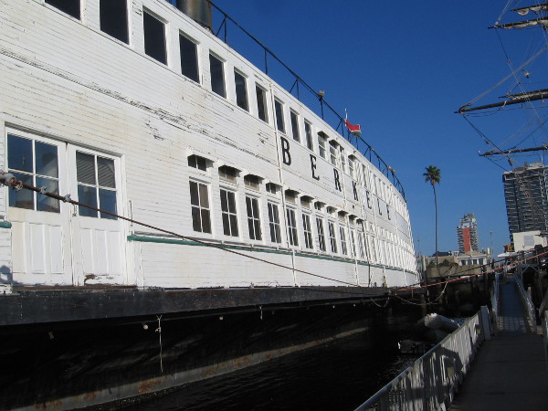 The Maritime Museum of San Diego’s historic 1898 steam ferry Berkeley is undergoing much-needed restoration. The wooden superstructure, exposed for many years to direct sunlight and weather, is in need of repair, as you can see from a couple of my photographs. The south side of the ship, which receives the most sunlight, is in especially poor condition. Work has already begun there.