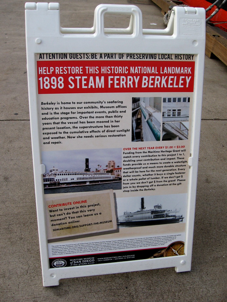Banner along entrance gangway explains the Historic National Landmark 1898 Steam Ferry Berkeley Preservation Project.