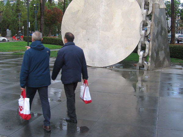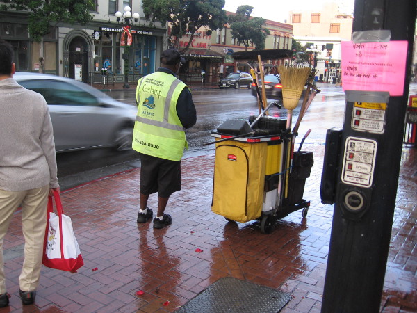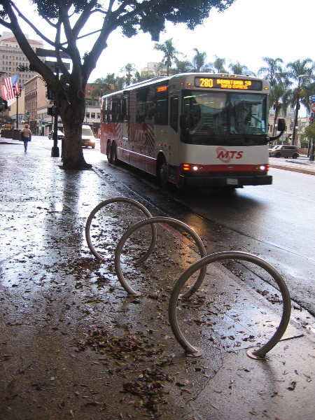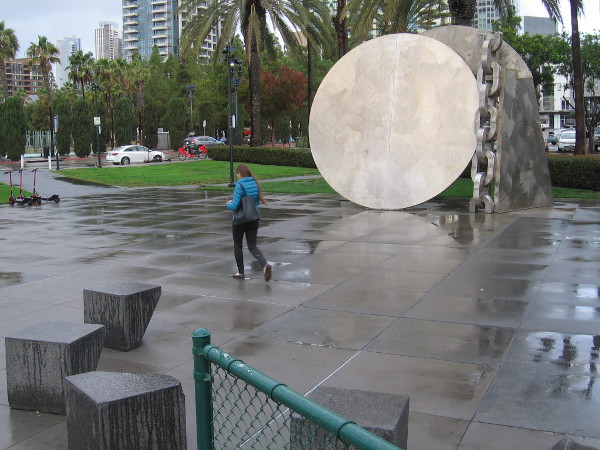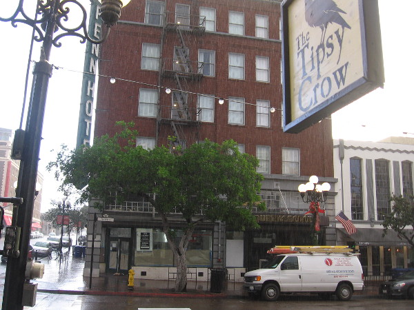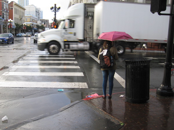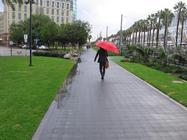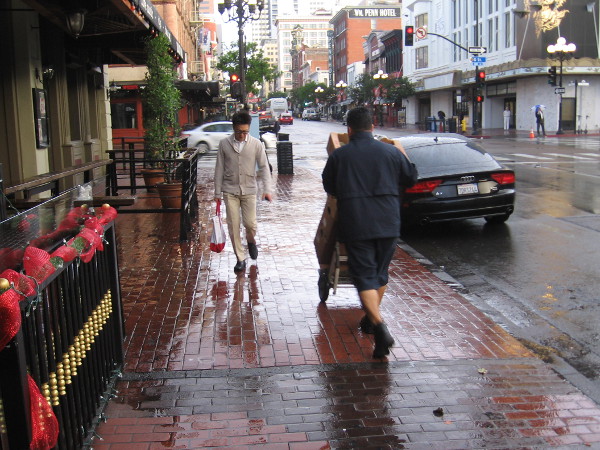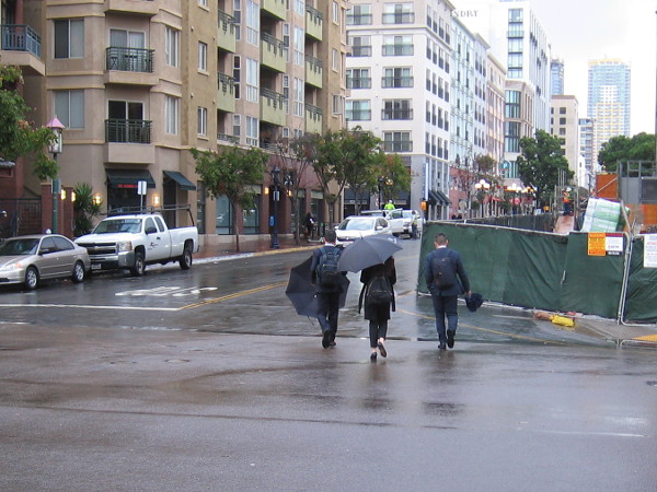 Keeping an eye on the direction of the wind and slanting raindrops, holding my camera at the ready under my umbrella, I headed down from Cortez Hill to the Gaslamp trolley station. I wasn’t the only one trying to cope with San Diego’s first real rainstorm of the winter.