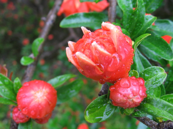 A spring storm creates unexpected natural beauty.Wet, very bright green leaves.Budding spheres of red. Like magic they open mysteriously.Water in the grooves of a beautifully marbled stone by the garden path.Droplets shining on a fern, like a curtain of beaded diamonds.Sunlight through dreamy, magical layers of green.Simple beauty at the always wonderful Japanese Friendship Garden.Fragile blooms encrusted with crystal-like rain.Smooth forms of beaded water on a sloping leaf.Another photograph of beauty in a special garden, on a rainy May day in San Diego.