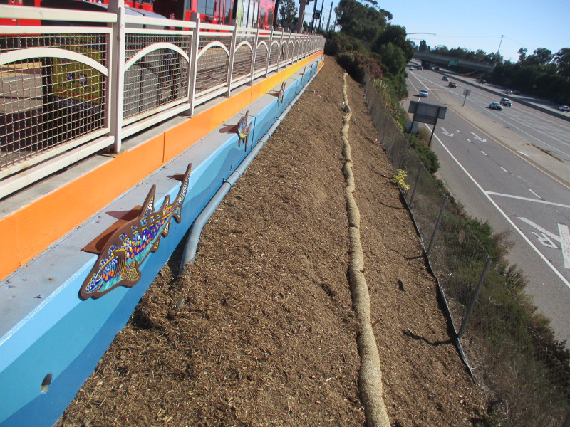 A week ago, members of the Lemon Grove volunteer group Revitalize Broadway planted an extensive pollinator garden next to the Lemon Grove Depot trolley station, in what is called Promenade Park. I first read about the project here. I saw the garden today!