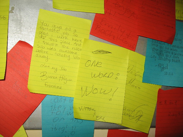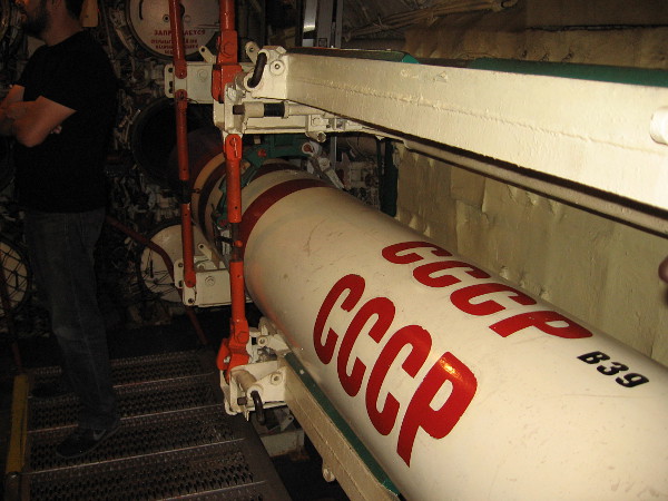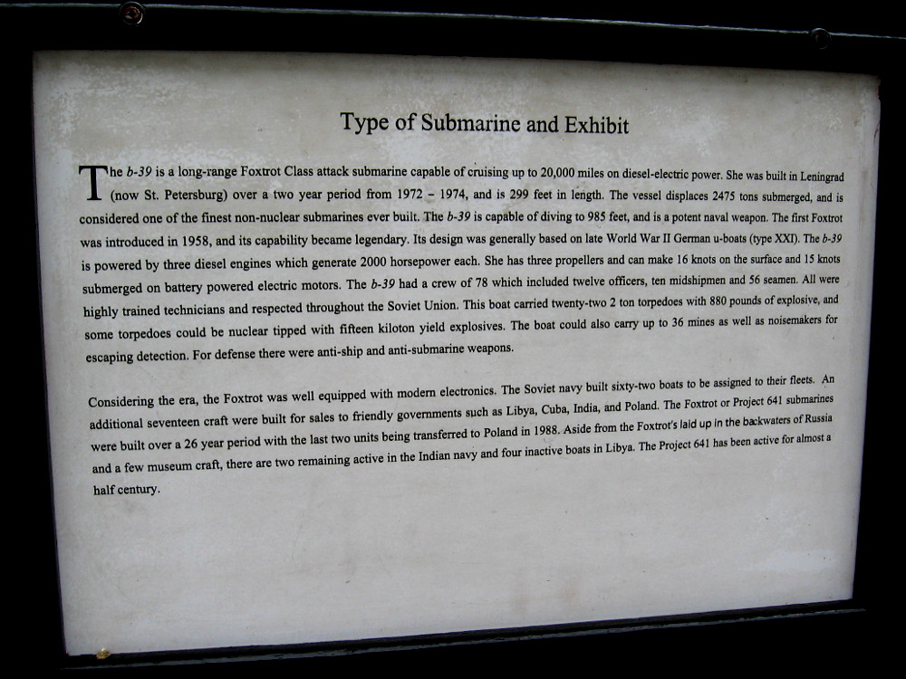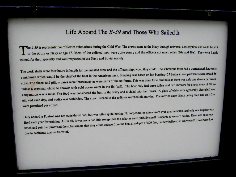 This man might have literally saved the world. Vasili Arkhipov argued against the B-59 captain’s determination to fire a nuclear torpedo against the U.S. aircraft carrier USS Randolph.Today, the Maritime Museum of San Diego’s B-39 Foxtrot-class Soviet submarine allows visitors to see what sub warfare was like during the Cold War, and to relive the crisis.Many signs containing interesting info can be read before boarding the B-39.Sign provides some details about the B-39. It could cruise 20,000 miles on diesel-electric power. It was built in Leningrad. It’s design was generally based on late World War II German u-boats.Life aboard a Foxtrot-class Soviet submarine is briefly described. Duty aboard a Foxtrot was not considered bad, but was often quite boring.Sign shows main parts of the museum’s current Cuban Missile Crisis exhibit. Inside the sub, one must nimbly climb through rather small circular openings!I’ve ascended the gangway and I’m standing forward of the submarine’s sail (or fin). I’ll enter the forward torpedo room via some steps behind me.Enter Here! And prepare to relive a tense moment in history, when the future of humankind teetered on the brink.Just inside the old Soviet sub. There’s a video explaining the Cold War and beginning of the Cuban Missile Crisis, and many signs nearby. The B-59 was armed with a Special Weapon: one nuclear torpedo.This museum torpedo represents what the B-59 Foxtrot carried back in 1962. A purple tip meant a particular torpedo had a nuclear warhead.You might note this torpedo has a purple tip! To fire a nuclear weapon during the Cuban Missile Crisis would have certainly resulted in World War III.A Hair’s Breadth from Nuclear War. President John F. Kennedy dealt with an extremely difficult crisis. Common sense, decisive action–and possibly some luck–helped the world avoid catastrophe.It’s no easy feat going from one section of the sub to another! A visitor is about to head into a narrow corridor en route to the Control Room.Heading through the Foxtrot-class Soviet submarine. Tiny rooms on either side include the Captain’s Cabin, the Officer’s Wardroom, and Medical Exam Room.A look into the Electronic Officer Cabin.The sonar room was critical to the safety of the submarine. Without sonar, the underwater vessel had no eyes.A photo of equipment in one corner of the sonar room.Into the Main Control Room we go, the scene of a sound and light show reenacting those tense minutes before the B-59 chose to surface peacefully without firing their nuclear torpedo.Signs throughout the Maritime Museum of San Diego’s Cuban Missile Crisis exhibit help visitors understand their position in the Foxtrot submarine.Photo includes the Foxtrot’s helm, where a Soviet sailor steered the submarine by moving a lever left and right.Visitor inside the Maritime Museum of San Diego’s B-39 submarine looks through the periscope. Red lights come on as depth charges are heard. A fateful decision must be quickly made.Voices from nearby speakers reenact tense discussions, then orders to the crew. The submarine captain wished to fire a nuclear torpedo; the level-headed flotilla commander convinced him not to.We’ve left the Control Room and are continuing along the center of the submarine. Here’s part of the galley. The crew ate well by Soviet standards–better than most ordinary citizens.More knobs, switches, levers, buttons, dials, gauges and whatnot on the way to the Engine Room.The engine room contains three turbo diesel engines that each put out 2000 horsepower. They drove three shafts connected to six-blade propellers.Another photo inside the museum’s B-39 engine room. During the 1962 events, the B-59’s batteries were low and the air conditioning had failed. Their hot engine room must have been intolerable.Now we’re heading to the Motor Control Room.Bunks for Enlisted Ratings line the corridor. These were shared by the crew and in constant use. No room to spare!A very tight squeeze!And finally we’ve made our way into the After Torpedo Room, where visitors can watch a concluding video documentary. After surfacing peacefully, the B-59 eventually re-submerged and vanished.School students left notes. It seems most really liked the tour! It’s not every day one can see the interior of a Cold War Soviet submarine!Climbing back out of the B-39 Foxtrot-class Soviet submarine, one of many historic vessels that are part of the Maritime Museum of San Diego.
