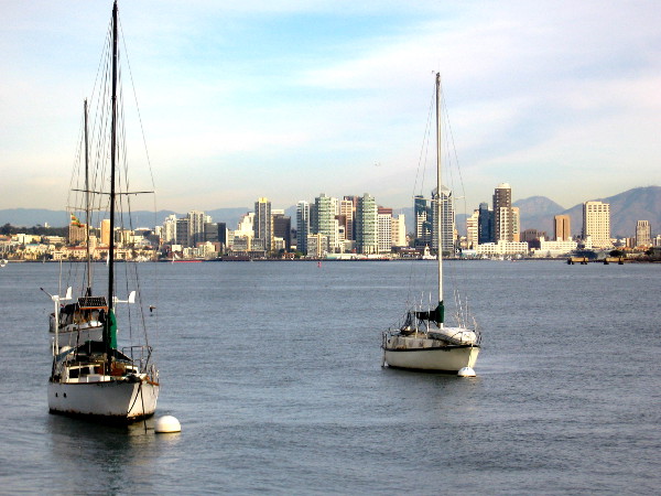 Sailboats moored near Shelter Island, downtown San Diego in the background.